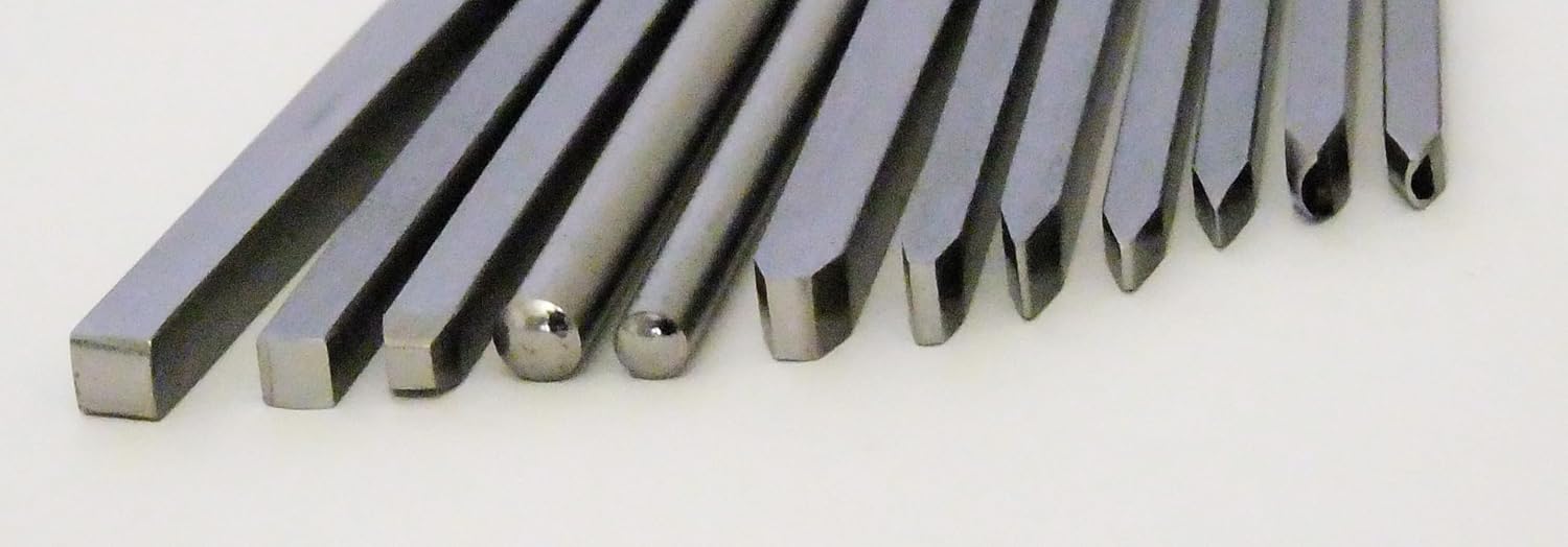 Meticulously crafted tool steel and then heat-treated in a kiln for hardened steel. Each repoussé and chasing tool is 4" long to provide maximum control. Multi profiles are included. You will be impressed with the exceptional workmanship applied to the creation of these outstanding tools. Suitable for stamping on Aluminum, Pewter, Alkeme, Copper, Brass, Nickel, Silver. Tips measure : 5.9mm 5mm 3.2mm 5.9mm 4.9mm 5.9 x 3.2mm 5.9 x 2mm 5.9 x .9 mm 3.5 x 1 mm 3.6 x 7.5mm 5.5 x 2.04 mm 4.3 x 2mm